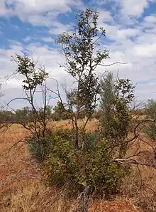 In the Northern Territory the species forms part of the upper shrub layer in mixed woodland communities on sandplains often found with Corymbia opaca, Hakea macrocarpa and Atalaya hemiglauca in the overstorey with Acacia coriacea and Streptoglossa odora in the shrub layer with a ground layer beneath including grasses such as Triodia pungens, Aristida holathera, Aristida contorta and Astrebla pectinata.[10] In the Pilbara of Western Australia it is found in low tree woodlands with Corymbia hamersleyana over Acacia tumida var. pilbarensis shrubland with Templetonia hookeri and Acacia adoxa over Triodia epactia hummock grasses.[11]