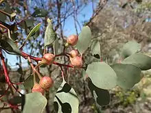 This mallee resembles E. orbifolia, with both having a similar leaf-shape, and it is also closely related to E. ewartiana and E. crucis.[2]