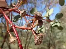 Eucalyptus websteriana is a mallee that typically grows to a height of 4–5 m (13–16 ft) with a spreading habit, and forms a lignotuber. It has reddish brown minnirichi bark on the trunk and branches. The adult leaves have a distinctive heart shape and the tree has a compact crown, providing lightly dappled shade that benefits plants in the undergrowth. The leaves are the same shade of greyish green on both sides, 18–45 mm (0.71–1.77 in) long and 9–30 mm (0.35–1.18 in) wide, tapering to a petiole 5–17 mm (0.20–0.67 in) long. The flower buds are arranged in leaf axils in groups of seven on an unbranched peduncle 9–12 mm (0.35–0.47 in) long, the individual buds on pedicels 3–7 mm (0.12–0.28 in) long. Mature buds are spherical, 5–10 mm (0.20–0.39 in) long and 5–8 mm (0.20–0.31 in) wide with a rounded operculum that has a small point on the top. Flowering occurs from July to November and the flowers are pale cream-coloured to yellow. The fruit is a woody hemispherical, sometimes conical, capsule 3–6 mm (0.12–0.24 in) long and 7–12 mm (0.28–0.47 in) wide with the valves protruding prominently.[3][4][5]