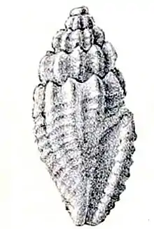 (Original description) The shell has an ovate fusiform shape. The upper whorls are in flesh colour. The last two are white. A pale brown band appears at the base of the body whorl. The suture is also discoloured by a faint band of the same colour. The shell contains 5 - 6 whorls, sculptured with spiral striae and coarse, somewhat distant transverse ribs which project above the suture. The suture is impressed. The aperture is narrow and oblique. The peristome is thickened and serrated by the spiral striae. The columella descends obliquely.[2]