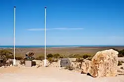 Eucla War Memorial, with the Airport runways and the Great Australian Bight behind it