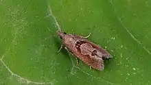 The length of the forewings is 8.1–11 mm for males and 8.2–10.3 mm for females. The forewings are brown with dark brown L-shaped marking with curved edges. There is a large faint tooth in the subterminal area. The hindwings are dirty white, shading to pale brown towards the outer margin. Adults are on wing from July to September.