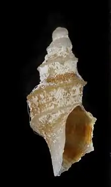The shell is longitudinally obscurely ribbed, and transversely striated. The ribs disappear towards the base, where the striae become stronger. The body whorl is tricarinate, those of the spire bicarinate. The carinae are nodulous. The color of the shell is whitish, maculated with yellowish chestnut.[2]