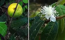 The genus was named after Francois Eugene, Prince of Savoy (1663–1736), an Austrian general who, with Marlborough, won the Battle of Blenheim and was a distinguished patron of art, science and literature.[4] The arazá is a shrub or small tree growing a height of 2.5–15 m, with densely branched canopy. The flaking bark has a brown to reddish colour. The leaves are simple, opposite, elliptical to slightly oval, 8–19 by 3.5–9.5 cm, apex acuminate, base rounded and often subcordate, margins entire, leaves dull and dark green with 6-10 pairs of impressed lateral veins, pale green, shortly pilose, with scattered hairs below. The inflorescences are in axillary racemes, usually with two to five flowers which are 1 cm wide and pedicillate, have 4 rounded sepals and 5 white, oval petals. Linear bracteoles, calyx 4 rounded, stamens 70 and long, ovary with 3–4 locules, each with 5–8 ovules, style 5–8 mm long. The fruits are a globose to oblate or spherical berry, 2–10 x 2–12 cm, which weighs up to 750g. They are pale green, verging on bright yellow, when ripe with a thin, velvety skin enclosing a juicy, aromatic, acid, thick pulp enclosing usually 12 seeds. The seeds are recalcitrant as they do not survive drying and freezing during ex-situ conservation.[2][3][4][5]