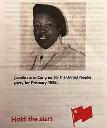 In 1986, she was a candidate to congresswoman for the United People's Party. She was the first black candidate in a non-traditional and communist party, as there was a historic covenant of the black community and the National Liberation Party. She decided to break that covenant in response to the social inequalities of the time.[3]