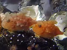 Eumicrotremus pacificus, sometimes known as the spotted lumpsucker[1] or the balloon lumpfish,[2] is a species of lumpfish native to the Northwest Pacific. It can be found in the Sea of Okhotsk, the Sea of Japan, the East China Sea, and the Pacific Ocean off Hokkaido and the Kuril Islands.[3] It may be confused with the closely related Eumicrotremus orbis, which overlaps with E. pacificus in range, although E. pacificus is larger, reaching 20 cm (7.9 inches) TL.[3] This fish is generally yellow to orange in color with small dark spots and its tubercles are usually smaller and less pronounced than E. orbis, giving it a less spiny appearance.