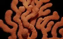 This fan is flattened and has curving branches which all tend to grow in the same plane. It may be mustard yellow to orange and when feeding the extended polyps give the fan a fuzzy appearance. It may grow up to 1m tall and have branches of 0.7 to 1 cm wide.[2]
