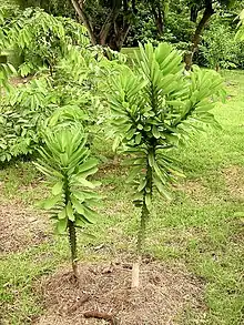 Euphorbia nivulia forms a small tree up to 9 m (30 ft) high and 1 m (3 ft) in girth. The bark is rough and thick. The branches are succulent, and grow out from the trunk at an obtuse angle. Spirally arranged tubercles on the branches bear clusters of sharp spines. The leaves are simple and arranged alternately, and have a very short or no stalk. The leaf blade is obovate and spoon-shaped to inverted-lance-shaped, up to 25 cm (10 in) long and 8 cm (3 in) wide. They are thick and fleshy, the tip is rounded, the base is tapered, and the margin is entire. The midrib is prominent on the underside of the leaf. The reddish cyathia (false flowers found in the genus Euphorbia) develop in groups of three in the axils of the leaves towards the ends of the branches. The fruits are divided into three parts, the lobes being compressed laterally. The seeds are four-angled and ovoid, smooth and about 4 mm (0.16 in) long.[1] This plant is similar to Euphorbia caducifolia, leafless milk hedge, but it retains its leaves for longer than does E. caducifolia, and does not form bushy thickets.[2]