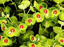 Euphorbia × martini, or Martin’s spurge, is a hybrid between two species of flowering plant, E. amygdaloides × E. characias subsp. characias[1] in the spurge family Euphorbiaceae. It was found growing wild in southern France.[2] Growing to 60 cm (24 in) tall and broad, it is a dwarf evergreen subshrub with narrow grey-green leaves and in late spring and early summer, sprays of lime green flowers, often with a red or maroon eye. It is useful as a spreading, weed-smothering groundcover.[2] Though hardy down to −15 °C (5 °F), it is a Mediterranean plant best grown in a sheltered spot in well-drained soil in full sun.