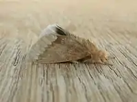 The wingspan is about 50 mm. Adults are hairy and brown, with a broad white band along the terminal area of each wing and a dark brown body.