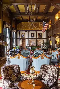 The 93,000 sq ft (8,600 m2) hotel, which fully occupies a city block, has had up to 104 guest rooms, including 99 rooms and five full suites. The hotel has historically contained up to three restaurants, two bars, two saunas, an indoor spa,[8] and nine meeting venues, all of which has been supported by up to 140 employees.[9] Resplendent with its courtyard (now primarily a swimming pool), grand entry, great lounge, and giant fireplace, and constructed of Redwood, it is the largest conference facility and third largest lodging property in the region.