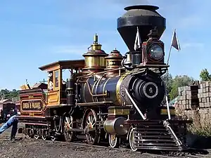 Warner Bros. bought the engine in 1939, and it was featured in many films, such as Torrid Zone, Cheyenne Autumn, and The Great Train Robbery. The Eureka's last film appearance was in the 1976 film, The Shootist.[7][8] In 1978, the California State Railroad Museum was in the process of restoring North Pacific Coast no. 12 Sonoma, another 8-18 C class 4-4-0 nearly identical to the Eureka. The museum had the latter stripped down to reveal its original paint scheme, and used it as a guide for restoring the former. The Eureka was sold in 1978 to Old Vegas, an amusement park in Henderson, Nevada, where it was placed on display in 1980.[6][9] In 1985, a fire occurred at Old Vegas, with a burning building collapsing on the Eureka, badly damaging the engine.[8]