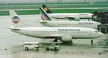 Air France, West Berlin's third scheduled carrier, had withdrawn entirely from the internal German market as long ago as 1969, reducing its presence at the city's Tegel Airport to providing a single daily non-stop scheduled service from/to Paris Orly only.[15][20][21] (This move was designed to staunch the growing losses Air France's internal German routes from/to Tegel had incurred ever since Pan Am had introduced jet equipment on its own internal German services from/to Tempelhof in 1966. Over the following two years, the airline's share of the total West Berlin — West Germany air travel market collapsed from 9% to less than 5%. Following the beginning of BEA's jet operations from Tempelhof in late 1968, Air France's share dropped even further. Other factors that contributed to the company's progressive decline in traffic on its internal German services included Tegel's greater distance from West Berlin's city centre compared with Tempelhof, the lack of a motorway connecting the airport to the city centre and poor public transport links. Compared with its two bigger rivals in the Berlin market, it served fewer German domestic routes at lower frequencies and did not promote these as effectively.[22] To keep a presence in the internal German air transport market from/to West Berlin, Air France had entered into a collaborative agreement with BEA. This agreement covered the Berlin–Frankfurt and Berlin–Munich routes. The agreement's intention was to enable both BEA and Air France to compete better with Pan Am's more frequent services on these routes by pooling their resources. It entailed the joint operation of these routes from Tempelhof with BEA BAC One-Eleven 500 aircraft, BEA flightdeck crews and mixed BEA/Air France cabin crews.[20][23][24] However, BEA's claim that it returned to profitability on both its Frankfurt and Munich routes from Berlin as a result of the collaborative agreement with Air France was contradicted by the latter's counter claim that it was still losing money on these routes, in spite of that agreement. This in turn led to the agreement's termination as of November 1, 1972. The same day, Air France introduced a second daily return flight between Orly and Tegel, which routed via Cologne in both directions to maintain the airline's internal German traffic rights from/to Berlin.[21][25][26][27] From April 1, 1974, Air France routed both of its daily Orly–Tegel services via Cologne, and from November 1, 1974, it switched them to the French capital's then new Charles de Gaulle Airport.[16][28] At the start of the 1976 summer timetable, Air France introduced a third daily CDG–Tegel frequency, which routed via Düsseldorf and utilised the Boeing 727-200, a bigger aircraft than the Caravelles used on the company's other services from/to Berlin.[29] Air France subsequently routed all of its CDG–Tegel flights via Düsseldorf and standardised the aircraft equipment on the 727-200/200 Advanced.[4])