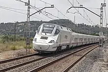 The service started using series 101 EMU rolling stock with bogies adapted for use on the 1,668 mm (5 ft 5+2132 in) Iberian gauge track. Traction current is supplied by overhead lines, at either 3,000 volts direct current, or 25,000 volts alternating current at 50 Hz. In normal commercial service these trains traveled at 200 km/h (120 mph) and had a top speed of 220 km/h (140 mph), although 250 km/h (160 mph) was reached during testing. The fleet of six units was built by the French multinational Alstom.