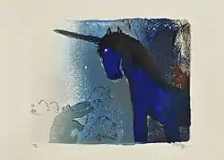 Another member of Der Blaue Reiter was Franz Marc, an artist who died prematurely in the world war. Particularly interested in the representation of animals, with which he symbolized communion with nature, he left sixty-three prints, made between 1908 and 1916.[31] Also worth mentioning is the sculptor Ernst Barlach, who was also an engraver and playwright. His graphic work spanned from 1910 to 1930, in lithography and woodcut: in the former technique he illustrated his own dramas (Der Tote Tag, 1912; Der arme Vetter, 1919), while in the latter he produced more stylized images (Der Kopf, 1919; Walpurgisnacht, 1923; Lied an die Freude, 1927).[32] In Austria, Oskar Kokoschka, an expressionist of personal inspiration, stood out, author of such lithographic series as Dreaming Children (1908), King Lear (1963), Odyssey (1963–1965), Saul and David (1966–1968) and Trojans (1971–1972).[33]