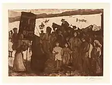 In Spain, a realist reaction arose in the 1960s in the face of the informalist current, which had as its exponent the group Estampa Popular, founded in 1958 in Madrid by José García Ortega, along with the outstanding Agustín Ibarrola and Ricardo Zamorano. Influenced by pop art and French New Realism, their style is realistic, in simple images, of clear and simple composition, marked by their political commitment anti-Francoist.[103] A split from the previous one was the Equipo Crónica, founded in 1964 in Valencia by Manolo Valdés, Rafael Solbes and Juan Antonio Toledo, with a realistic style influenced by pop art and mass media.[104] Other Spanish artists of these years who practiced printmaking were: Luis Gordillo, Juan Genovés, Joan Hernández Pijuan, Albert Ràfols Casamada, Josep Maria Subirachs, Eduardo Arroyo, José Hernández and Javier Mariscal.[105]