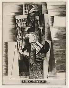 Picasso was the most prominent representative of Cubism, a movement based on the deformation of reality through the destruction of the spatial perspective of Renaissance origin, through an organization of space according to a geometric plot, with simultaneous vision of objects and a range of cold and muted colors. The members of this group contributed a new conception of the work of art, thanks to the introduction of collage.[12] Other exponents of this movement in the graphic field were Georges Braque, Juan Gris, Louis Marcoussis and Jacques Villon. Braque was, together with Picasso, the father of cubism. His printmaking started late, once he had already abandoned cubism and in a neoclassical style, as can be seen in his etchings for the Theogony of Hesiod (1931).[13] The Spaniard Juan Gris began in humorous drawing in magazines such as Le Charivari and Le Cri de Paris. In 1912 he switched to cubism, with an orthodox style but with a strong personality. He produced thirty-four lithographs and etchings, in compositions similar to his pictorial work.[14] He illustrated several books: Ne coupez pas, Mademoiselle, ou les erreurs des P. T.T. by Max Jacob (1920), Mouchoir des nuages by Tristan Tzara (1925), A Book concluding with as a wife has a cow a love story by Gertrude Stein (1925) and Denise by Raymond Radiguet (1926). He also did some portraits in lithography (Marcelle la Brunette, Marcelle la Blonde, Jean the Musician).[15] Marcoussis went through Impressionism and Fauvism before arriving at Cubism. A virtuoso draughtsman, he worked as a caricaturist for several newspapers. He began printmaking in 1912, but devoted himself more intensely to it between 1930 and 1940: Aurelia by Gérard de Nerval (1930), Tables of Salvation (1931), Alcoholes by Apollinaire (1934–1935), plus a hundred portraits (Gertrude Stein, 1934; Miró, 1938).[16] Villon, brother of Marcel Duchamp, was initiated into printmaking at the age of six by his grandfather, Émile Nicolle. Gifted in drawing, he worked for several newspapers and magazines. From 1899 he engraved for the publisher Edmond Sagot; among his first works are the series Minnie's Bath (1907) and Nudes (1909–1910). Already in the cubist period he made his Equilibrista (1913), one of the best prints of this style. In 1920 he made Tablero de ajedrez, a reproduction of the painting of the same name. The following year he illustrated the Architectures by Paul Valéry. Between 1923 and 1930 he made reproductions of works by Picasso, Matisse, Cézanne, Renoir and Van Gogh to make ends meet. In 1939 his Three Orders wqas followed by series of landscapes, among which his Orchards series (1940–1941) stands out. Later, Cuarto de buey (1941) and Globo celeste (1944) stand out.[17]
