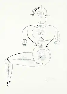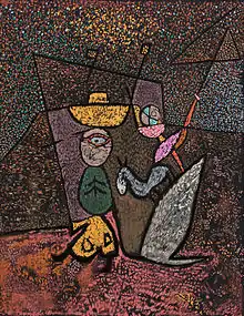 Other Surrealist artists who practiced printmaking were Paul Klee, Max Ernst, André Masson and Yves Tanguy. Klee started in the Jugendstil and was a member of the expressionist group Der Blaue Reiter, before turning to surrealism. He recreated in his work a fantastic and ironic world, close to that of children or madmen. In his compositions he was especially interested in aspects such as color, light, time and movement. He worked mainly in lithography: Sommeil d'hiver (1938), Tête d'enfant (1939).[56] Ernst went through expressionism, Dadaism and surrealism, with an original work of strong personality. His first prints (1911–1912), in linocut, are related to the group Die Brücke. In his Dadaist stage he elaborated the lithographic series Fiat modes, pereat ars (1919), where he shows the influence of metaphysical Giorgio de Chirico. He later practiced other techniques such as collage, photomontage and frottage.[57] Of particular note is his novel-collage Une semaine de bonté (1933), engraved in woodcut, in a realistic style charged with humor and eroticism, with a certain Goyaesque influence.[58] Masson was initiated in cubism until leading to a surrealism marked by graphic automatism. He illustrated books such as Justine by Marquis de Sade (1928) and Martinique, enchantress of snakes by André Breton (1941), as well as various works by Mallarmé, Coleridge and Malraux.[59] Tanguy was characterized by a type of imagery in desert plains of infinite horizon and milky light populated by biomorphic beings, which he transferred to his graphic work.[60]