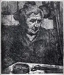 During the First World War, due to the difficulty in finding quality materials, he had to resort to photoengraving for some of his editions. Even so, he achieved quality products, especially thanks to the collaboration on the artistic side of Georges Rouault. Vollard's first collaboration with this artist took place in 1912, when Rouault offered him to edit a Miserere on which he was working; Vollard bought it in exchange for illustrating a book written by the dealer himself, Les Réincarnations du Père Ubu, which would not see the light until 1932. The Miserere (1916–1927) is one of the most original and creative series of prints of the 20th century, in which the artist combined different techniques: the drawing was transferred to copper plates by means of heliogravure, on which Rouault worked with acid and etching tools, achieving unique tones and values in the history of printmaking.[6] In the 1920s, Vollard resumed publishing original prints, publishing works by Georges Braque, Marc Chagall, Raoul Dufy, Jules Flandrin, Tsuguharu Foujita, Aristide Maillol and Maurice de Vlaminck.[7] His last two editions, before his death, were of works by Rouault: Cirque de l'étoile filante (1938) and Passioné (1939).[8]