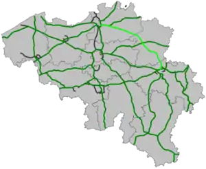 The European route E 313 is a road in Europe and a part of the United Nations International E-road network. Approximately 112 kilometers (70 mi) long, it connects the Belgian port city of Antwerp to Liège, the commercial and industrial centre of Wallonia. It runs thus entirely within Belgium: however, it does cross the language frontier within Belgium between the Dutch speaking Flanders and the French speaking Wallonia which affects the roadside route signs and safety-message posters. From the junction at Ranst where it splits from the E 34, it follows the Belgian A13.