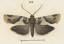 The wingspan is 13โ14 mm. The forewings are whitish ochreous, marbled with pale ferruginous. The hindwings are dark fuscous grey, but somewhat lighter towards base.[2]