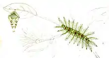 Armed with ten pairs of long, horizontally projected, very delicately branched spines. Colour grass green with a dorsal row of large purplish-brown angulated spots each with or without a small pure white diamond spot in its middle, these dorsal spots placed on the anterior half of the 4th, 6th, 7th, 9th, 10th, 11th and 12th segments; the lateral spines green tipped with purple brown.[4]