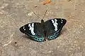 Female. Similar, paler. Upperside forewing: the transverse crimson bands in cell obscure with a broad black-bordered white band interposed, the discal series of white spots very large, very irregular in shape. Hindwing: the ground colour suffused with greenish blue on terminal posterior half of wing; markings similar to those of the male. Underside brown, the tornal half of the hindwing bluish green. Forewing: the markings as on the upperside with the addition of two small black spots at base and an obscure broad terminal pale band. Hindwing with four black-bordered transverse crimson spots at base in addition to the markings as on the upperside. Antennae, head, thorax and abdomen as in the male, but paler; the palpi beneath with a stripe of pink, the forelegs whitish.[4][5]