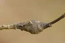 The larvae do not usually form galls, making a tunnel as they feed within the shoot. When a gall is formed it can be a 10 millimetres (0.39 in) to 15 millimetres (0.59 in) long by approximately 5 millimetres (0.20 in), elongate swelling, that tapers into the stem. The bark around the gall is smooth and contains one larva which has three dorsal annulets on the third abdominal segment, and a suranal plate without pseudocerci.[2][4] Pupation takes place within the shoot.[2]