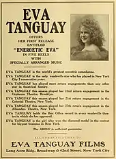 Eva Tanguay (August 1, 1878 – January 11, 1947) was a Canadian singer and entertainer who billed herself as "the girl who made vaudeville famous". She was known as "The Queen of Vaudeville" during the height of her popularity from the early 1900s until the early 1920s. Tanguay also appeared in films, and was the first performer to achieve national mass-media celebrity, with publicists and newspapers covering her tours from coast-to-coast, out-earning the likes of contemporaries Enrico Caruso and Harry Houdini at one time, and being described by Edward Bernays, "the father of public relations", as "our first symbol of emergence from the Victorian age."[2]