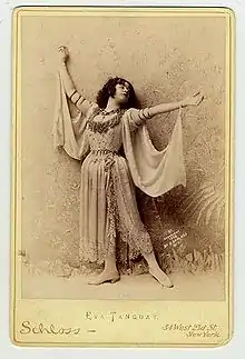 After seeing her perform, English poet and sexual revolutionary Aleister Crowley called Tanguay America's equivalent to Europe's music hall greats Marie Lloyd of England and Yvette Guilbert of France. The American Genius, he wrote, "is unlike all others. The 'cultured' artist, in this country, is always a mediocrity... The true American is, above all things, FREE; with all the advantages and disadvantages that that implies. His genius is a soul lonely, disolate, reaching to perfection in some unguessed direction... Eva Tanguay is the perfect American artist. She is... starry chaste in her colossal corruption."[9]