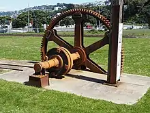 Cog Park is a grassy park situated between the patent slip site and the Evans Bay Yacht Club. The park is in two parts, separated by Evans Bay Parade. The seaward side of the park is on land that was reclaimed in two stages, firstly for the flying boat base in 1951 and then for port purposes in 1967.[59] Buildings on the site associated with the flying boat base were demolished in the early 2000s. The park gets its name from a large cog wheel that was once part of the patent slip winding gear. The cog wheel used to sit on the grass on the seaward side but was later installed across the road at the patent slip heritage site. The park is used by joggers and walkers and includes a fenced dog exercise area on the landward side.[60]