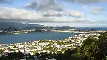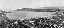 ![]() Aerial view of Evans Bay, showing marina at bottom centre, Miramar peninsula in the centre and the eastern side of Wellington Harbour in the distance. | |