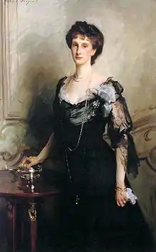 Victor succeeded his uncle as 9th Duke of Devonshire in 1908, whereupon Evelyn became the Duchess of Devonshire.[1] The Devonshires were one of the country's richest families, thought by some to have more wealth than the royal family.[9] The Duchess was to oversee four large estates in England and one Irish castle.[3] With her new position, she oversaw the reorganisation of the Devonshire estates.[1] The Duchess strictly adhered to etiquette and her position,[9] being characterised by a brother-in-law as "accustomed to authority."[10] She was known for her abrasive personality; her granddaughter-in-law wrote that she "was not altogether easy to get on with,"[11] whilst another referred to her as "an unpleasant woman."[10] Her husband's biographer described her as "cold, authoritarian, and frugal,"[1] and a servant recalled that "she wouldn't speak to you unless she wanted something, and I can't say she ever thanked you either."[10]