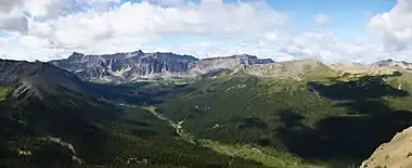Evelyn Peak is a 2,855 m (9,367 ft) mountain summit in the Athabasca River valley of Jasper National Park, in the Canadian Rockies of Alberta, Canada. THe nearest higher peak is Mount Kerkeslin, 5.0 km (3.1 mi) to the southwest, and Mount Hardisty is 6.0 km (3.7 mi) to the northwest.[1] All three are part of the Maligne Range. Evelyn Peak is composed of sedimentary rock laid down during the Cambrian period and pushed east and over the top of younger rock during the Laramide orogeny.[3] The mountain is at the headwaters of Evelyn Creek,[4] and three kilometres south of Evelyn Pass.[5] The creek and pass were named in 1921 for Evelyn Cavendish, Duchess of Devonshire (1870–1960), who visited nearby Maligne Lake in 1920.[6] The mountain's name however, has not yet been officially adopted by the Geographical Names Board of Canada.