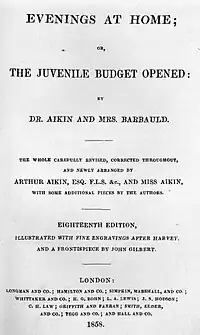 Evenings at Home, or The Juvenile Budget Opened (1792–1796) is a collection of six volumes of stories written by John Aikin and his sister Anna Laetitia Barbauld. It is an early example of children's literature. The late Victorian children's writer Mary Louisa Molesworth named it as one of the handful of books that was owned by every family in her childhood and read enthusiastically.[1] In their introduction, the authors explain the title in these words: