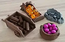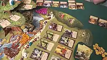 Over four seasons, players place their forest animal meeples to get resources to buy cards into a personal tableau, which give points towards winning the game or special abilities to help them build further.[2] The game starts simply, with the complexity increasing as a player's cards gain synergies from newly acquired cards.[3] In addition to the points they get from acquiring cards, players score by triggering events, from special events, from collecting certain combinations of card types, and from end game bonuses given by cards for acquiring certain other cards in their city.[4][5]