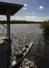 • Chickees are located along rivers and bays where dry land is inaccessible. They are elevated 10' x 12' wooden platforms with roofs. A walkway leads to a self-contained toilet. You'll need a free–standing tent, since stakes or nails are not allowed. No campfires are allowed on chickees. Some paddlers have difficulty accessing chickees from their boats. A loop of heavy rope may be helpful.[1]