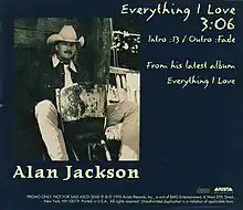"Everything I Love" is a song written by Harley Allen and Carson Chamberlain, and recorded by American country music singer Alan Jackson. It was released in January 1997 as the second single and title track from his album of the same name. The song reached number 9 on the U.S. country singles charts with it.