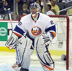 In August 2011, Nabokov stated that he would be reporting to New York's training camp. He played for the team the entirety of the 2011–12 season, wearing the number 20, and eventually took over the starting goaltender position. He got his first win with the team on October 15, 2011, against the New York Rangers.[25] On January 14, 2012, Nabokov recorded his 300th career win against the Buffalo Sabres, becoming the 26th goaltender to reach the milestone.[26] On March 21, 2012 he signed a one-year, $2.75 million contract extension to remain with New York for another season,[27] followed by another one-year $3.25 million contract for the 2013–14 season.[28]
