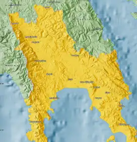 The Taygetus Massif is about 100 km (62 mi) long, extending from the center of the Peloponnese to Cape Matapan, its southernmost extremity. It contains the tallest mountain in the Peloponnese, the Profitis Ilias summit, reaching 2,405 m (7,890 ft);[6] this is probably the classical Mount Taléton mentioned by Pausanias.[7] The summit is an ultra-prominent peak. It is prominent above the Isthmus of Corinth, which separating the Peloponnese from mainland Greece, rises only to approximately 60 m (200 ft). Numerous creeks wash down from the mountains and the Evrotas has some of its headwaters in the northern part of the range. The western side of the massif houses the headwaters of the Vyros Gorge, which carries winter snowmelt down the mountain, emptying into the Messenian Gulf in the town of Kardamyli. The Parnon Massif is divided into three parts.[8] The northernmost, which is the highest, runs 30 kilometres (19 miles) from just north of Ano Doliana in North Kynouria, eastern Arcadia, southeast to Platanaki Pass. Platanaki, ancient Glyppia, is on the ancient route from Therapnes to South Kynouria between the peaks of Parnon, 1,935 metres (6,348 feet), and Psaris, 1,836 m (6,024 ft). Altitudes on the north rise from 1,100 m (3,600 ft) to 1,300 m (4,300 ft) increasing toward the peak to 1,600 m (5,200 ft) to 1,800 m (5,900 ft) with a tree line at 1,750 m (5,740 ft). Below it are forests of Black Pine and fir; above it, grasslands. Between the pass and Kounoupia to the south is 22 km (14 mi) of central Parnon, lower in altitude than the northern. The remaining 38 km (24 mi), even lower in altitude but still mountainous, runs from Kounouria to the sea at Epidaurus Limera, which is in Monemvasia. Parnon proper does not extend into the Malea Peninsula. In addition to the range of Parnon, two forelands can also be defined, east and west. Kynouria is located in the east foreland. In the west two lengths can be distinguished: from the northern flank of Parnon to Gkoritsa in Therapnes (on the road to Platanaki Pass), which is 6 km (3.7 mi) to 15 km (9.3 mi), and southward into the Malea Peninsula, 3 km (1.9 mi) to 9 km (5.6 mi) wide.