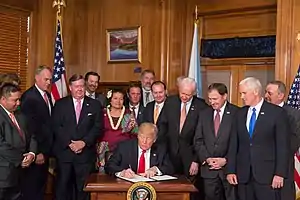 Executive Order 13792, entitled "Review of Designations Under the Antiquities Act," is an executive order issued by US President Donald Trump on April 26, 2017, that directed the Secretary of the Interior to review designations of national monuments made since 1996.[1] The order applies to all new monuments greater than 100,000 acres in size and monuments that were expanded by at least 100,000 acres. Twenty-two land monuments and five marine monuments that were created by the administrations of Bill Clinton, George W. Bush, and Barack Obama were subject to review.[2][3]