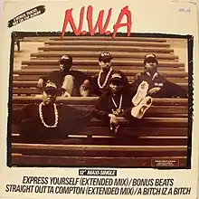 "Express Yourself" is a song recorded by American hip hop group N.W.A, performed solo by Dr. Dre. The song, off their 1988 album Straight Outta Compton, samples Charles Wright & the Watts 103rd Street Rhythm Band's song of the same name.[3] Unlike most songs on the album and by N.W.A, the song is devoid of profanity and violence. "Express Yourself" was released in 1989 as the album's last single, the album version of the track features rap vocals from Dr. Dre only whereas the 2002 reissue, single edition and video version features small verses from MC Ren and Ice Cube, the writer of the song. The song reached number 26 in the UK in September 1989.[4]