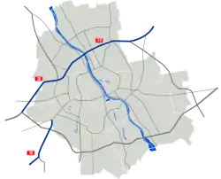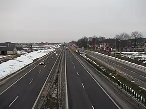 S8 runs through Warsaw and is part of its network of bypass roads. Various fragments were completed between 2010 and 2015.[4][5] It was constructed mostly as an upgrade of the city's existing inner highways. As such, it might be considered not to fully meet the definition of a bypass due to it serving both the transit and local district traffic at the same time. In the peak hours, large traffic jams form on this section every day.