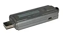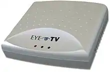 The first EyeTV hardware device was introduced in November 2002.[1] It was a small USB-powered device that contained a cable tuner and hardware encoder in order to convert television video into an MPEG-1 format for watching on a computer.[2] It also had coaxial and RCA plugs to connect it with a VCR or camcorder.[2] A 2002 article in Macworld said it was the "first step" in bridging computers and television, but at this point still had "some kinks".[2]