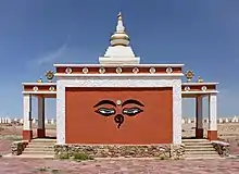 The Eyes of Buddha (also called Buddha eyes or Wisdom eyes[1]) is a symbol used in Buddhist art. The symbol depicts two half-closed eyes, a style sometimes referred to as the Adamantine View (Sanskrit: Vajradrsti).[2] In between and slightly above the eyes is a circle or spiral which represents the urna,[3] one of the thirty-two characteristics of a great man (Sanskrit: Mahāpuruṣalakṣaṇa) in Buddhism.[2] Directly below the urna is a curly symbol stylized as १, which represents the number one in Devanagari numerals.[4][5] The curly symbol, which represents either a nose or a divine fire emanating from the urna above, symbolizes unity.[1]