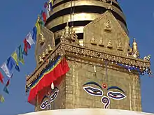 The Eyes of Buddha are painted[7] onto the upper portions of many Tibetan-style stupas, mostly throughout Nepal.[1][8] The symbol is painted on all four sides of the cube at the top of the stupa to symbolize the Buddha's wisdom seeing all things in all four cardinal directions.[1] Two of the most well-known examples are the historic stupas at Swayambhunath[9] and Boudhanath,[10] which both comprise two of the seven Kathmandu Valley UNESCO World Heritage Site monuments located in Kathmandu in Nepal.[11]