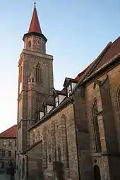 The Protestant Church of St. Michael is the oldest building in Fürth. Its beginnings go back to around 1100, the 45-metre (150  ft) tower was added around 1400 at the beginning of the Late Gothic period, and most of the building work was carried out in the 15th century. The interior of the church is mainly Neo-Gothic in character, with most of the Late Gothic ornaments having been replaced in the 19th century. The only remaining late Gothic ornament is the tabernacle on the North wall; it is 6.8 metres (22 ft 4 in) high and was probably created around 1500–1510 by artists near to Adam Kraft. It is the church's most valuable work of art. Other churches with gothic parts from 14.–16. century are St.Johannis in Burgfarrnbach, St.Peter and Paul in Poppenreuth and St.Matthäus in Vach. St. Peter and Paul probably has some older parts, the previous building was probably founded around 900 – 1000 and was mother Church of many other churches f.e. St.Sebald in Nuremberg.