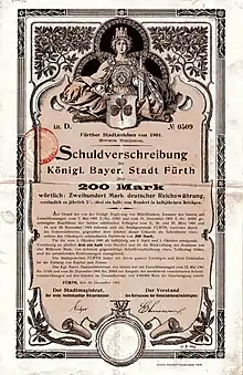 Founded as a Franconian settlement in the mid-8th century AD,[4] the first historical mention of Fürth was in a document dated 1 November 1007, in which the Emperor Heinrich II donated his property in Fürth to the newly created Bishopric of Bamberg.[5] The name "Fürth" derives from the German word for "ford", as the first settlements originated around a ford. In the following years, Fürth was granted market privileges, but these were later lost to the neighbouring Nuremberg, under Heinrich III. From 1062 onward, Fürth was again permitted to have a market, but by that time Nuremberg was already the more important town.