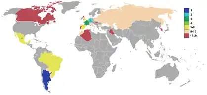 Although Mexico, United States and Canada submitted bids on 11 March 1983 to be the replacement host, the five-person special FIFA committee responsible for recommending the bids to the Executive Committee (Exco) announced on 31 March that it would only consider Mexico's bid, saying the United States and Canada had "deviated" from FIFA's criteria[10] and Exco members refused to visit Canadian and American stadium sites.[11] On 20 May, the committee announced Mexico as the replacement hosts despite Havelange stating that the United States and Canada had made better presentations.[11] Mexico became the first nation to host two World Cups, as it had hosted the 1970 FIFA World Cup.
