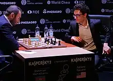 In January, at the 2016 Tata Steel Chess Tournament, Caruana shared second (along with Ding Liren) with a score of 8 points out of 13 (+5-2=6), defeating Michael Adams, Wei Yi, Loek Van Wely, Pavel Eljanov, and Ding Liren, and losing to David Navara and Evgeny Tomashevsky. Had he defeated Tomashevsky, he would have at least tied for 1st place with Magnus Carlsen. Through this tournament, he gained 7 rating points and moved to #3 in the world. By March, as part of the qualification cycle for the World Chess Championship 2016, Caruana participated in the Candidates Tournament 2016, held in Moscow, Russia, from March 10–30 in the Central Telegraph (Центральный телеграф) Building. The lineup of the tournament included Viswanathan Anand, Hikaru Nakamura, Sergey Karjakin, Peter Svidler, Veselin Topalov, Anish Giri, and Levon Aronian. In the final round Caruana had Black against Sergey Karjakin in a winner-takes-all game. A complex position developed in which he made a mistake and was eventually defeated, making Karjakin the official challenger. Caruana eventually finished with a +1 score.[37] On April 25, Caruana became US Chess Champion for the first time, after defeating IM Akshat Chandra in the last round of the US Chess Championship. He finished the tournament with 8.5 points out of 11 games, and went undefeated. The field consisted of world top ten players Hikaru Nakamura and Wesley So; top 100 players Ray Robson, Sam Shankland, Gata Kamsky, and Alexander Onischuk; GMs Alexander Shabalov, Varuzhan Akobian, Jeffery Xiong and Aleksandr Lenderman; and IM Akshat Chandra.[38] In September, he played first board of the US Team at the 42nd Chess Olympiad. The US team won the gold medal, while Caruana won the bronze medal for first board.